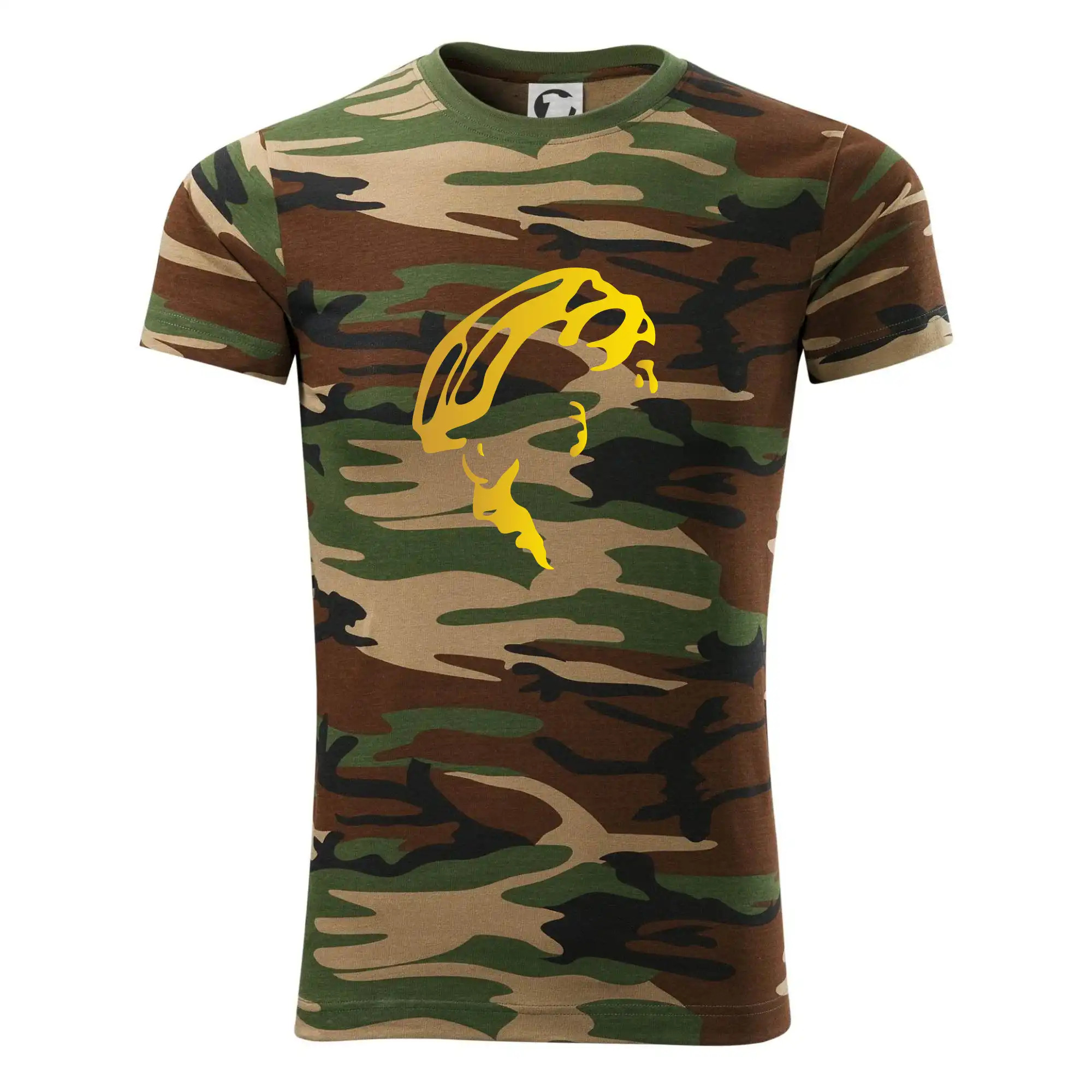 Tričko strednej gramáže vo farbách camouflage. Strih s bočnými švami. Lem priekrčníku z rebrového úpletu s prídavkom 5% elastanu. Vnútorná časť zadného priekrčníka začistená páskou vo farbe camouflage.