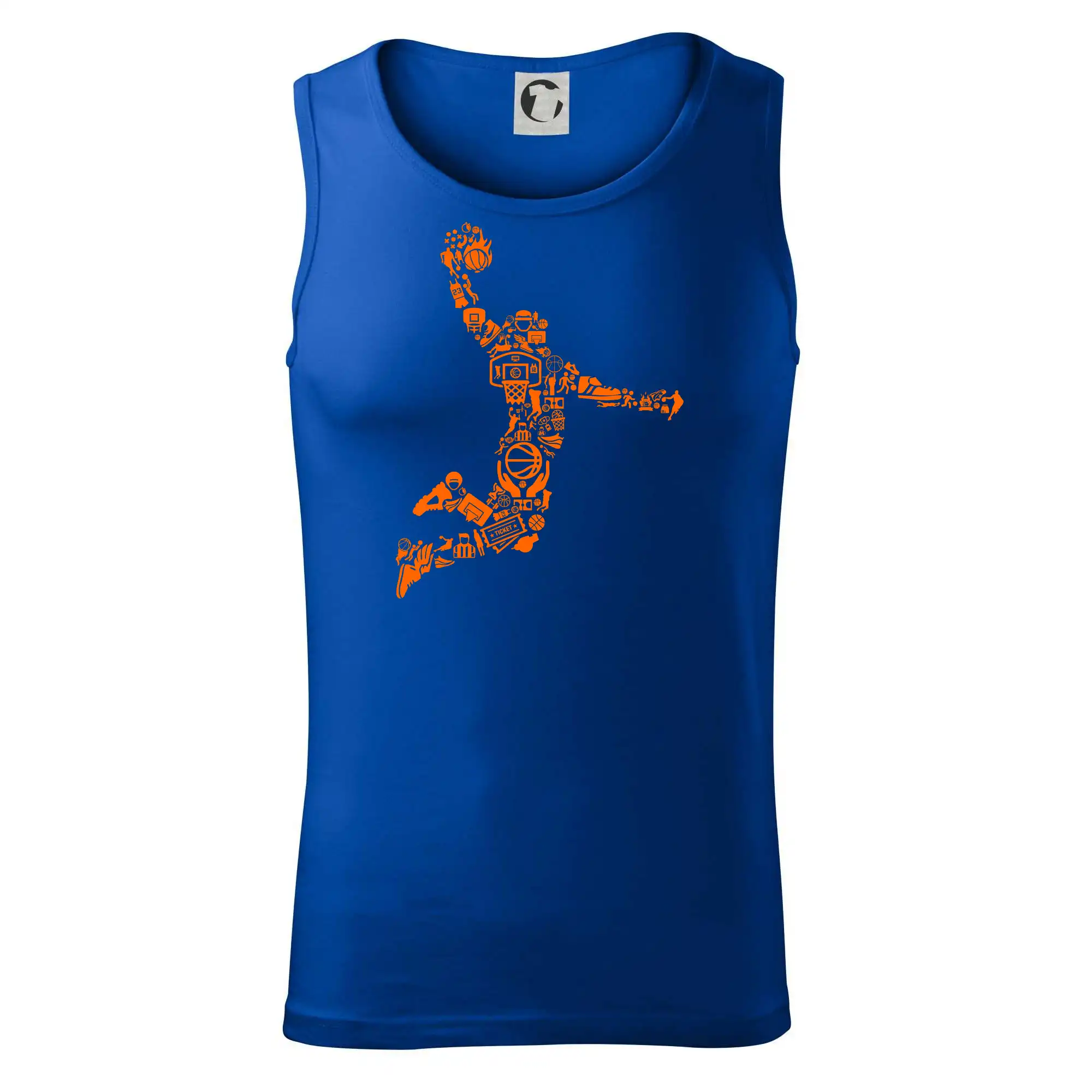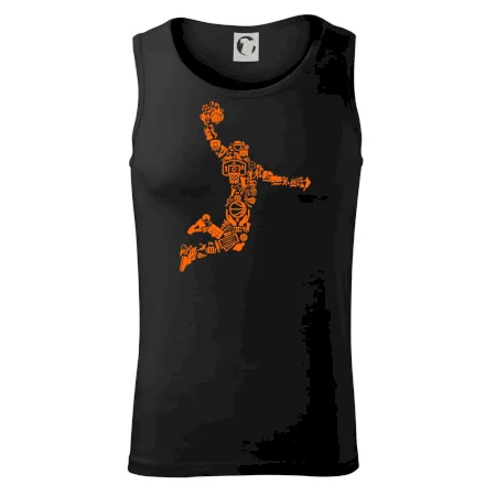 Triko s basketbalovým hráčem vytvořeným z typických basketbalových ikon, které jsou typické pro tuto míčovou hru. Perfektní dárek pro basketbalistu, basketbalista na triku.