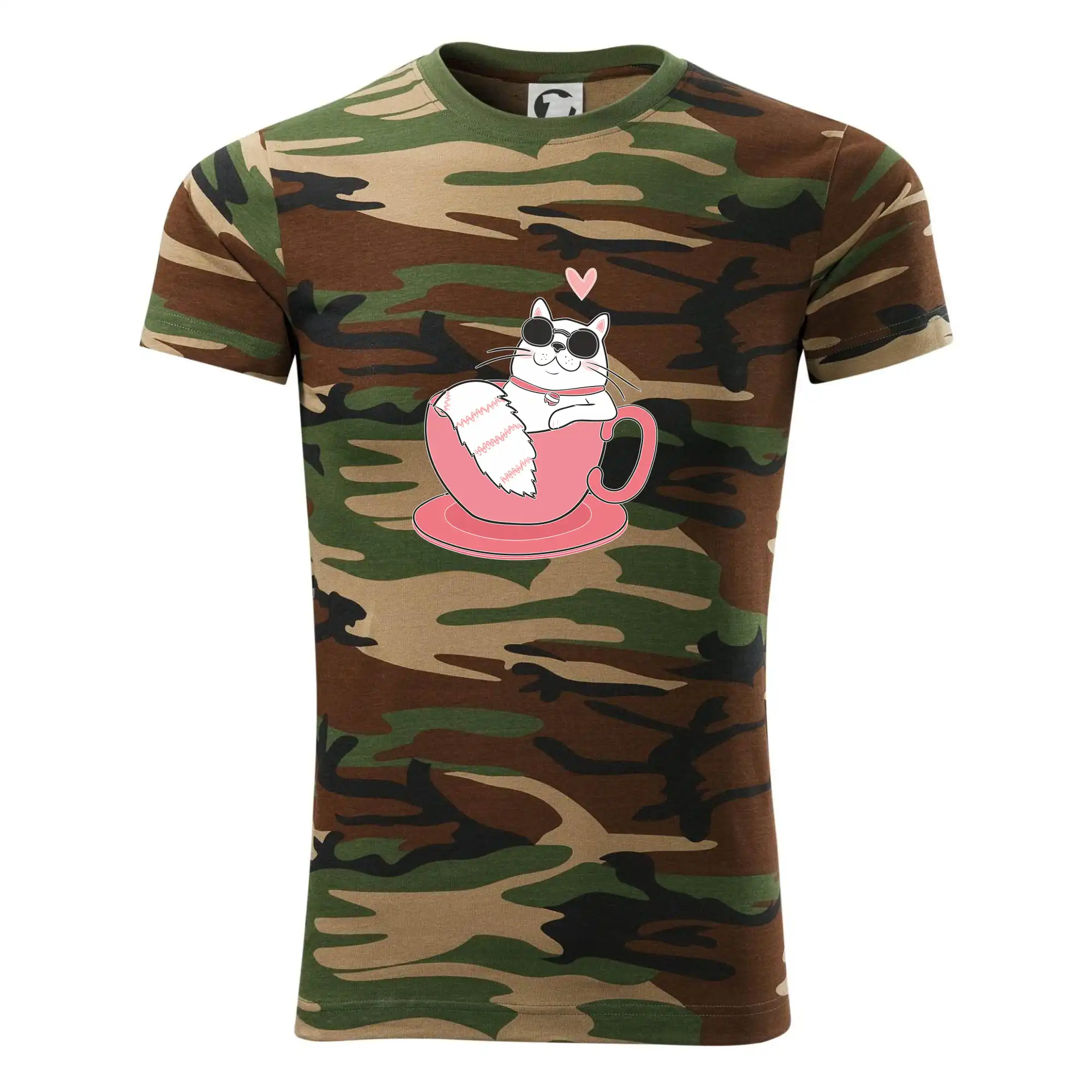 Tričko strednej gramáže vo farbách camouflage. Strih s bočnými švami. Lem priekrčníku z rebrového úpletu s prídavkom 5% elastanu. Vnútorná časť zadného priekrčníka začistená páskou vo farbe camouflage.