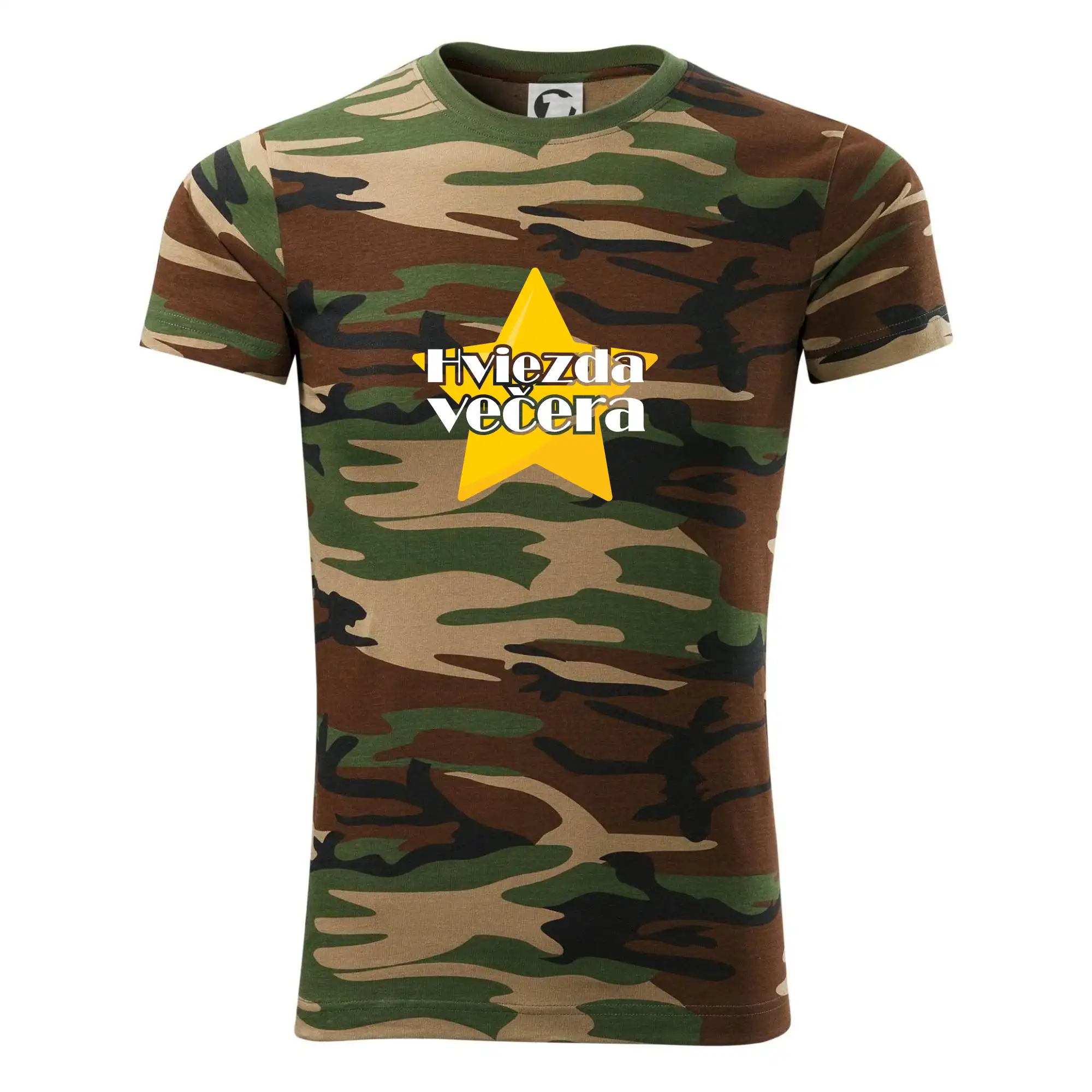 Tričko strednej gramáže vo farbách camouflage. Strih s bočnými švami. Lem priekrčníku z rebrového úpletu s prídavkom 5% elastanu. Vnútorná časť zadného priekrčníka začistená páskou vo farbe camouflage.
