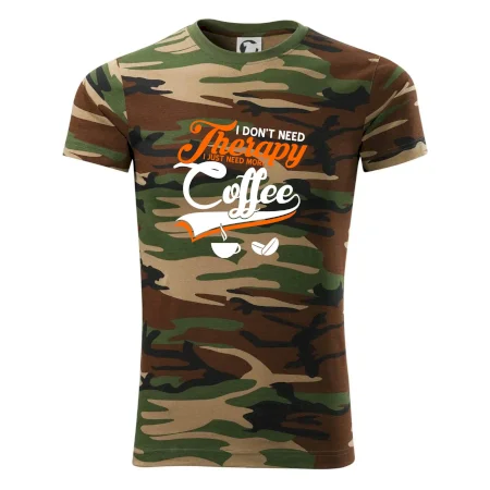 Tričko strednej gramáže vo farbách camouflage. Strih s bočnými švami. Lem priekrčníku z rebrového úpletu s prídavkom 5% elastanu. Vnútorná časť zadného priekrčníka začistená páskou vo farbe camouflage.