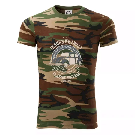 Tričko strednej gramáže vo farbách camouflage. Strih s bočnými švami. Lem priekrčníku z rebrového úpletu s prídavkom 5% elastanu. Vnútorná časť zadného priekrčníka začistená páskou vo farbe camouflage.
