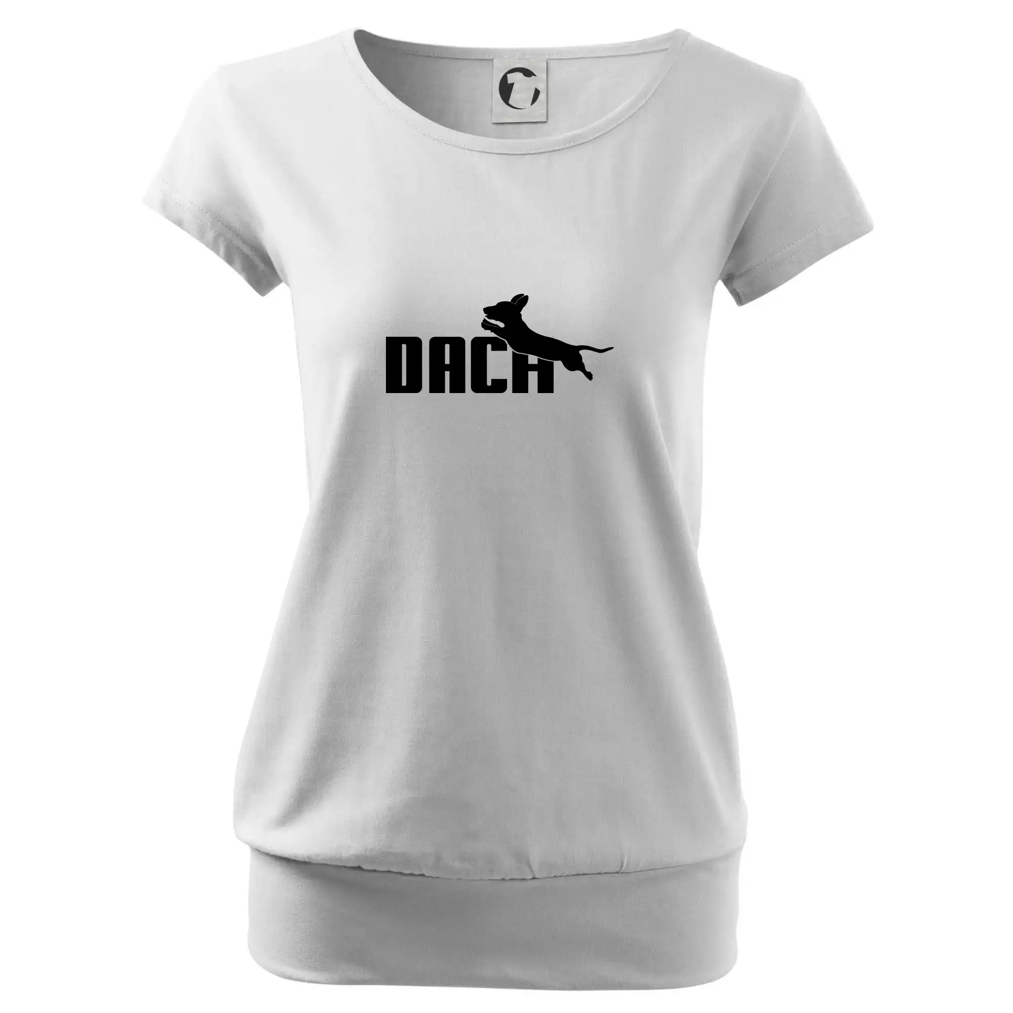 Trendové dámske tričko s veľmi krátkym rukávom, voľnejšieho strihu, v dolnom kraji všité do širokého lemu. Okrúhly priekrčník s úzkym lemom zo zhodného materiálu.