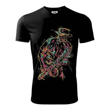 Tričko, na ktorom je kreslený jazzman, poteší každého priaznivcov jazzu. Hudobné tričko so saxofónom je vhodný darček pre saxofonistu. Pokiaľ je saxofón a hudba na každom Tvojom kroku, toto tričko sa k Tebe bude skvelo hodiť! Tričko pre saxofonistu a pravého jazzmana.