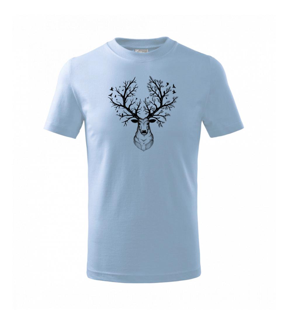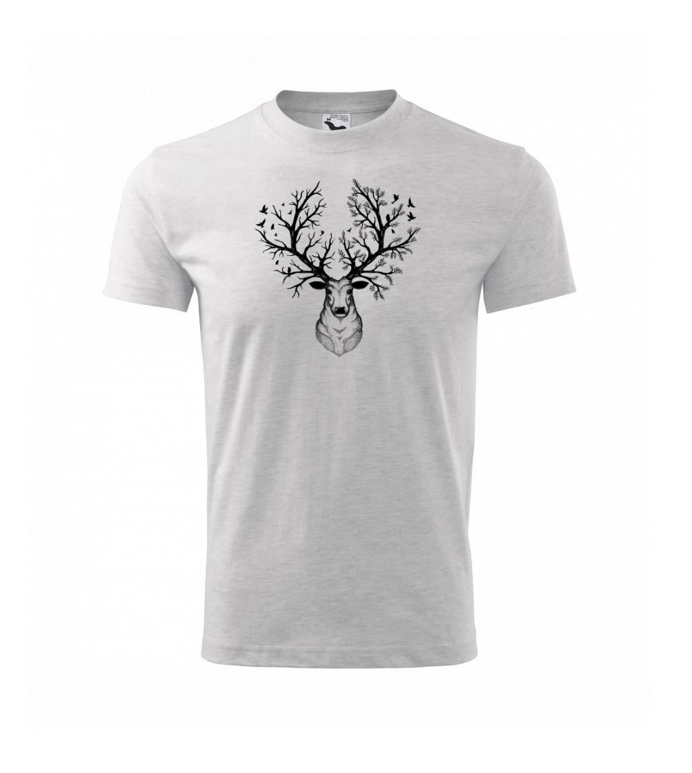 Tričko s jeleňom je vhodné pre všetkých milovníkov zvierat a prírody. Hlavný motív je zviera - hlava jeleňa s parožím, ktoré je zobrazené ako strom. Tričko, na ktorom je jeleň je vhodný darček pre milovníka prírody. Parožie jeleňa je rozrastené ako strom.