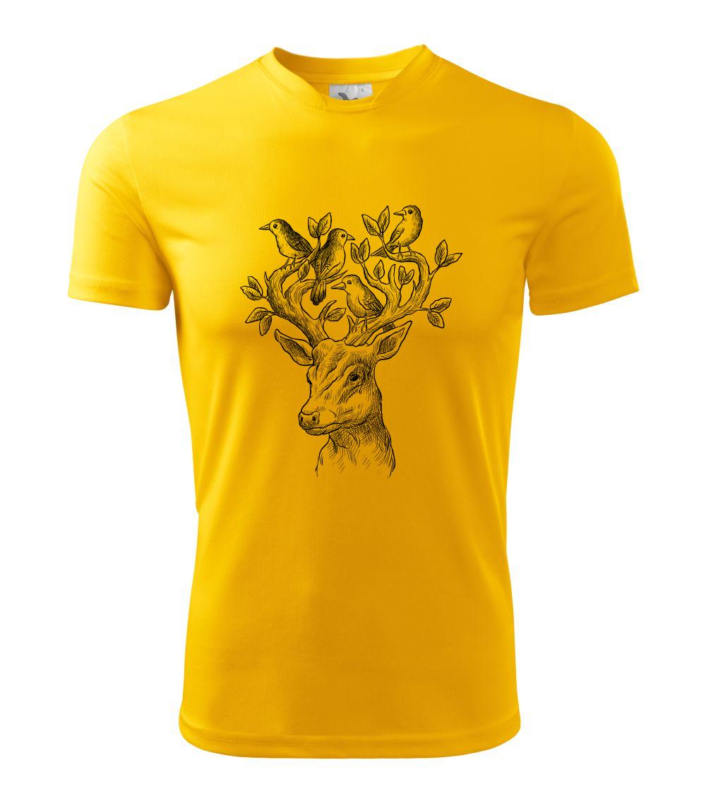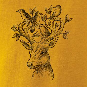 Tričko s jeleňom, ktorý ma na paroží celý svet. Jeleň na tričku je vhodný darček pre milovníka prírody. Jelenie parohy zdobí aj nejaký ten vtáčik. A kto by nechcel mať na tričku takéto pekné zviera?