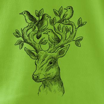 Tričko s jeleňom, ktorý ma na paroží celý svet. Jeleň na tričku je vhodný darček pre milovníka prírody. Jelenie parohy zdobí aj nejaký ten vtáčik. A kto by nechcel mať na tričku takéto pekné zviera?