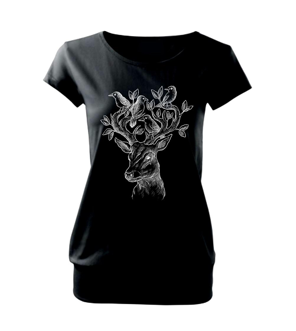 Tričko s jeleňom, ktorý ma na paroží celý svet. Jeleň na tričku je vhodný darček pre milovníka prírody. Jelenie parohy zdobí aj nejaký ten vtáčik. A kto by nechcel mať na tričku takéto pekné zviera?