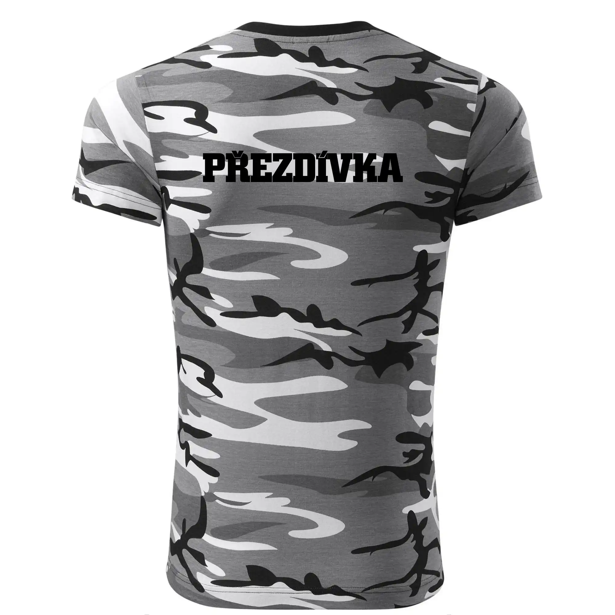 Tričko strednej gramáže vo farbách camouflage. Strih s bočnými švami. Lem priekrčníku z rebrového úpletu s prídavkom 5% elastanu. Vnútorná časť zadného priekrčníka začistená páskou vo farbe camouflage.