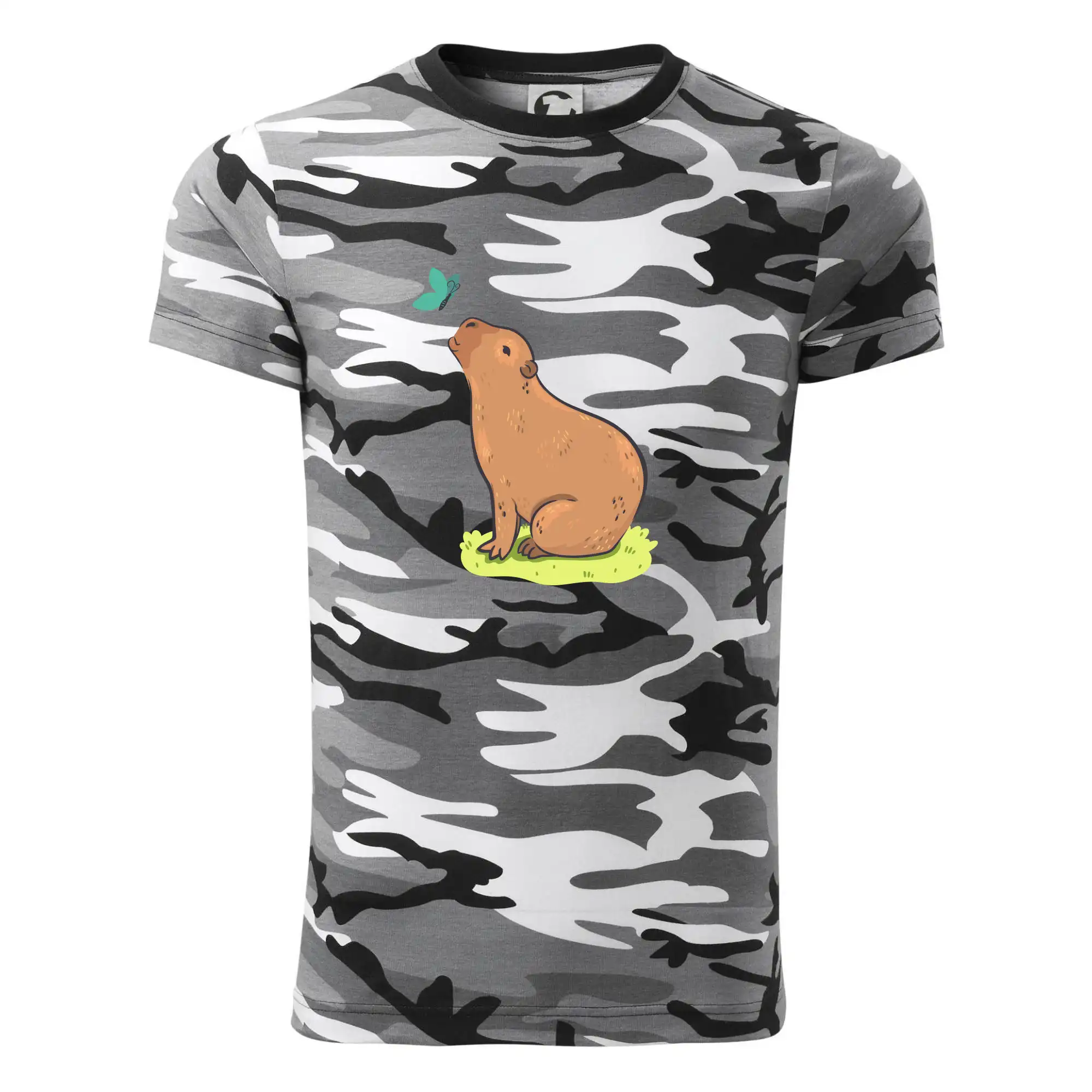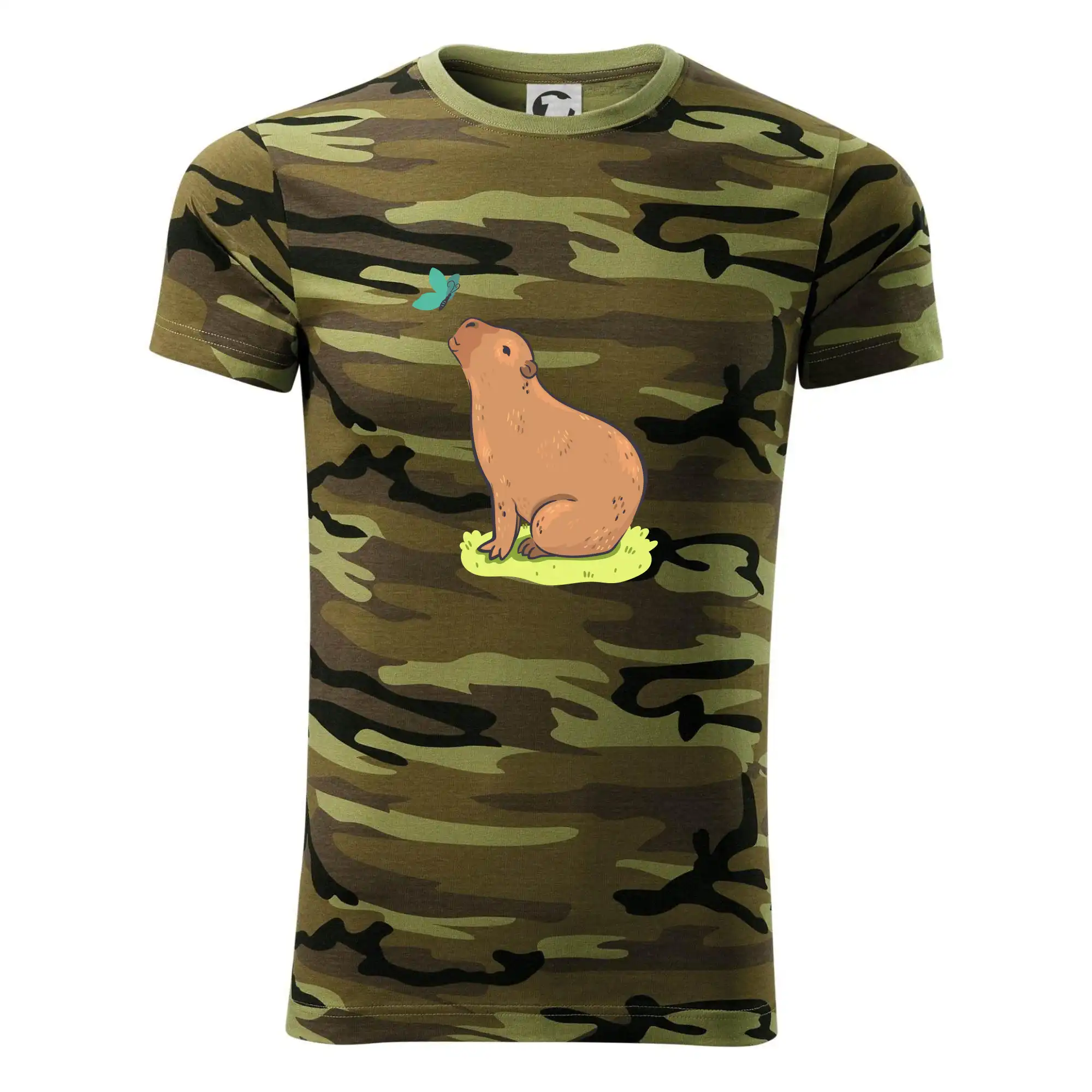Tričko strednej gramáže vo farbách camouflage. Strih s bočnými švami. Lem priekrčníku z rebrového úpletu s prídavkom 5% elastanu. Vnútorná časť zadného priekrčníka začistená páskou vo farbe camouflage.