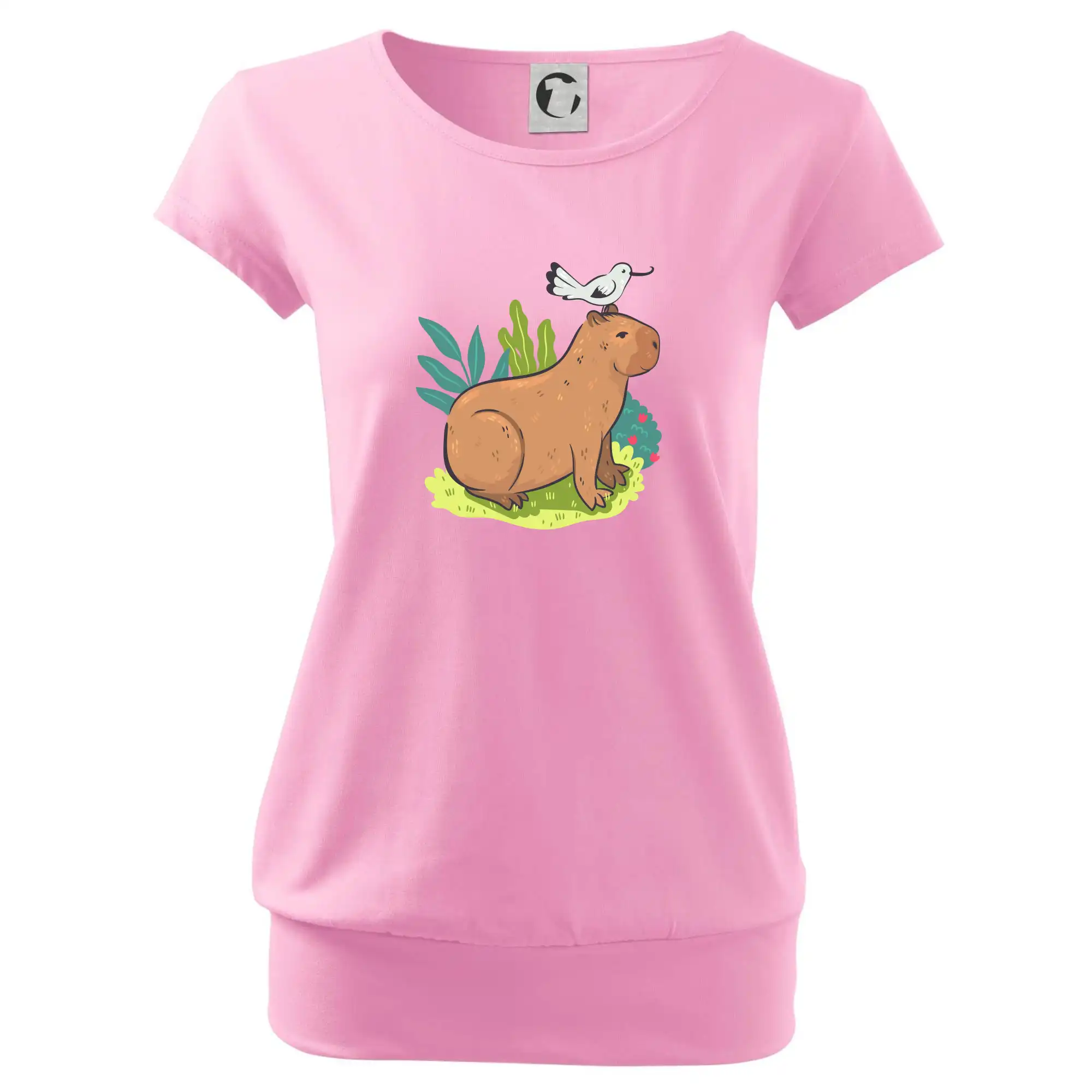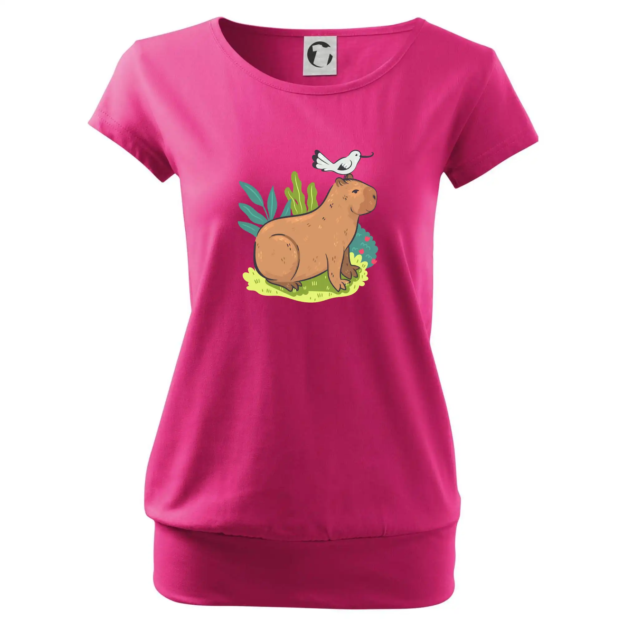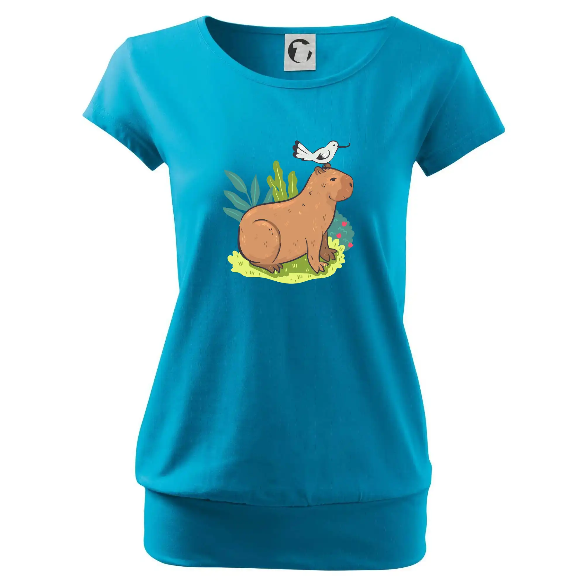 Trendové dámske tričko s veľmi krátkym rukávom, voľnejšieho strihu, v dolnom kraji všité do širokého lemu. Okrúhly priekrčník s úzkym lemom zo zhodného materiálu.