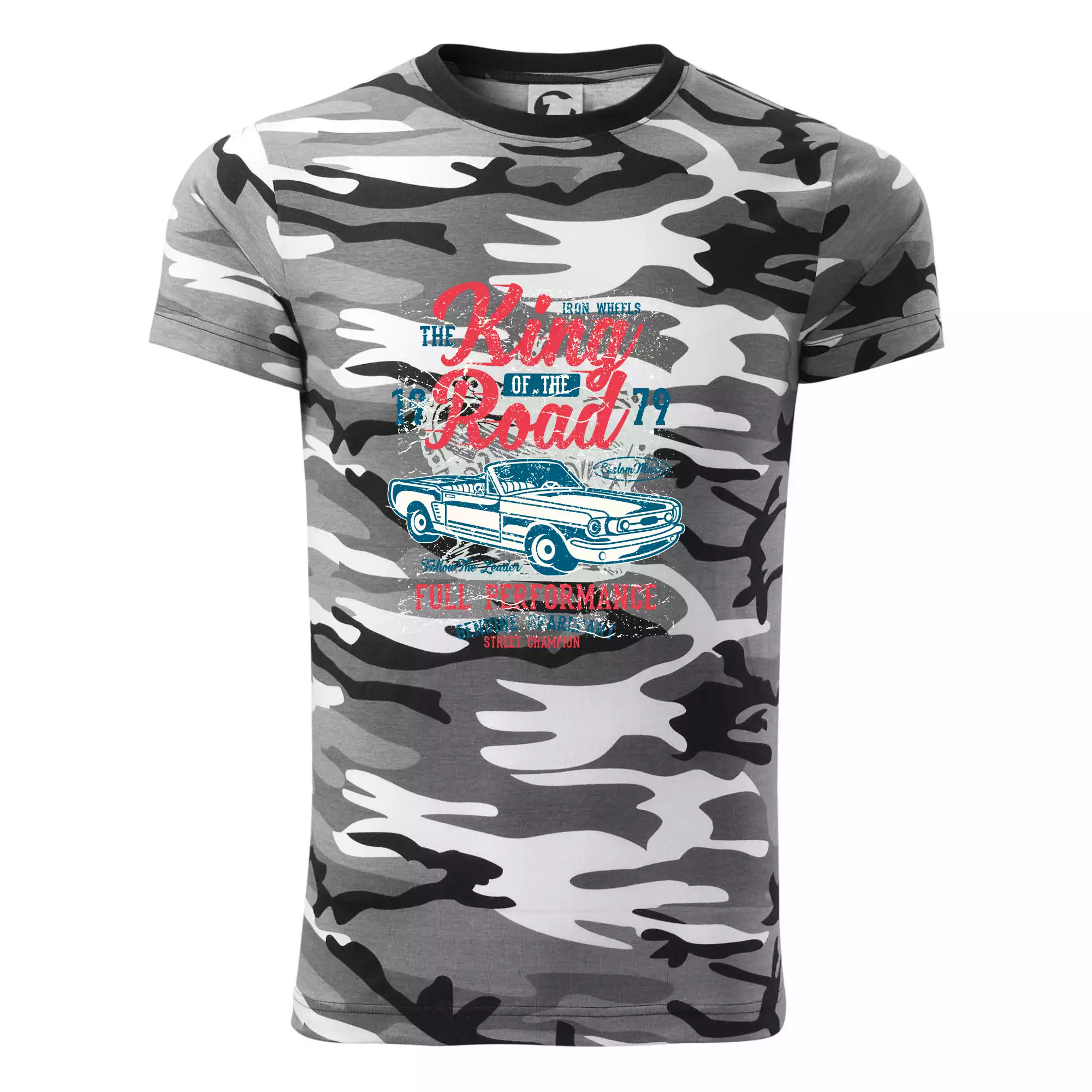 Tričko strednej gramáže vo farbách camouflage. Strih s bočnými švami. Lem priekrčníku z rebrového úpletu s prídavkom 5% elastanu. Vnútorná časť zadného priekrčníka začistená páskou vo farbe camouflage.