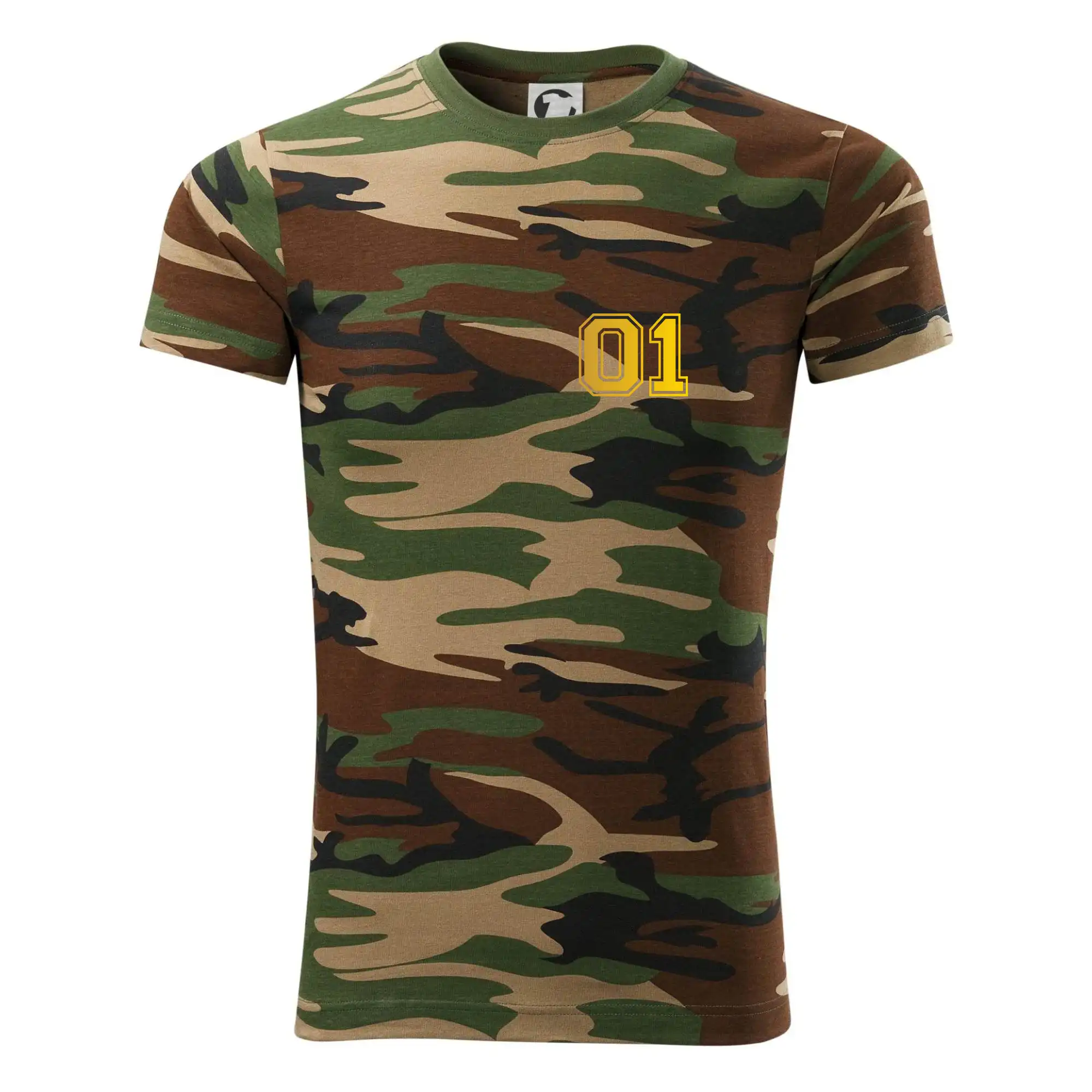Tričko strednej gramáže vo farbách camouflage. Strih s bočnými švami. Lem priekrčníku z rebrového úpletu s prídavkom 5% elastanu. Vnútorná časť zadného priekrčníka začistená páskou vo farbe camouflage.