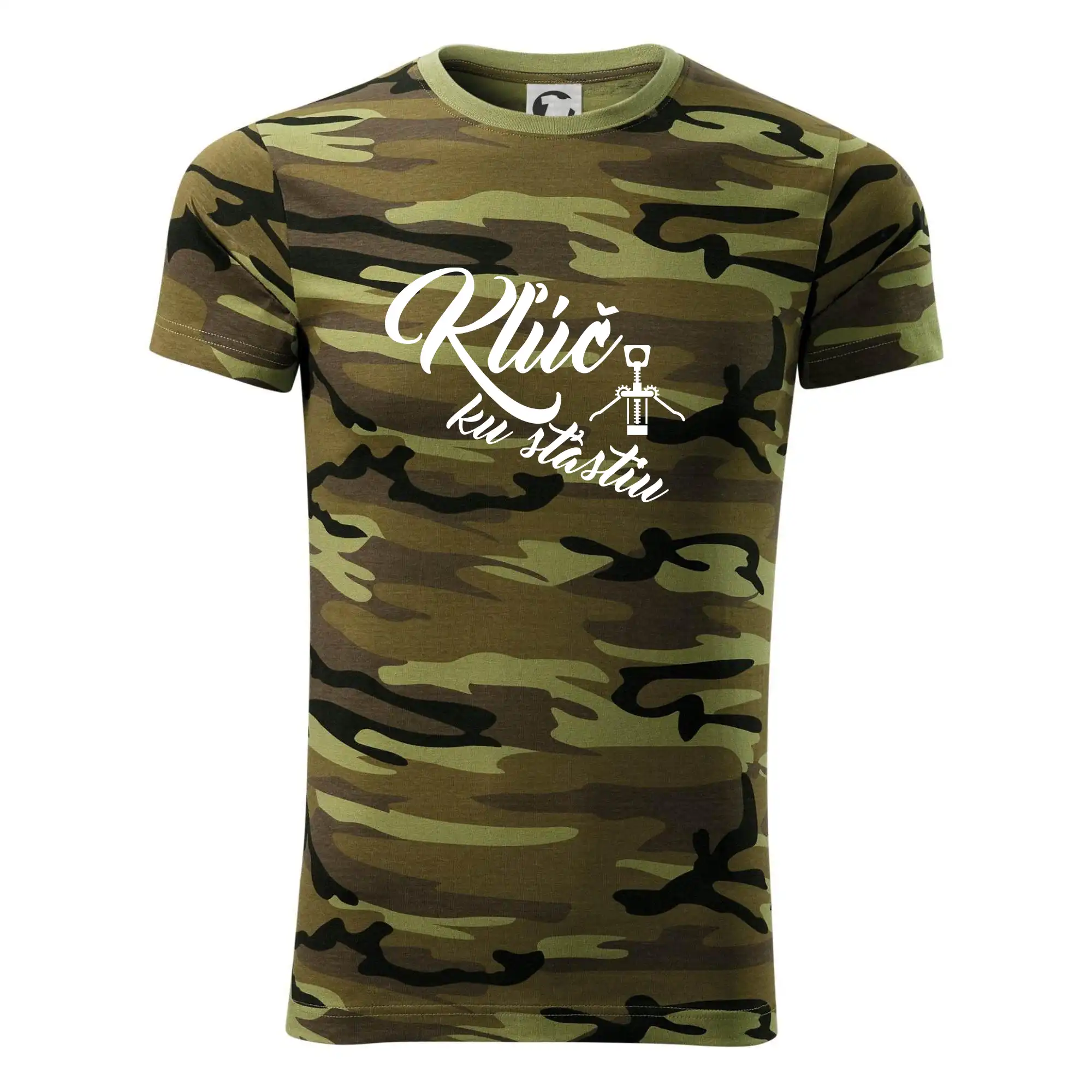 Tričko strednej gramáže vo farbách camouflage. Strih s bočnými švami. Lem priekrčníku z rebrového úpletu s prídavkom 5% elastanu. Vnútorná časť zadného priekrčníka začistená páskou vo farbe camouflage.
