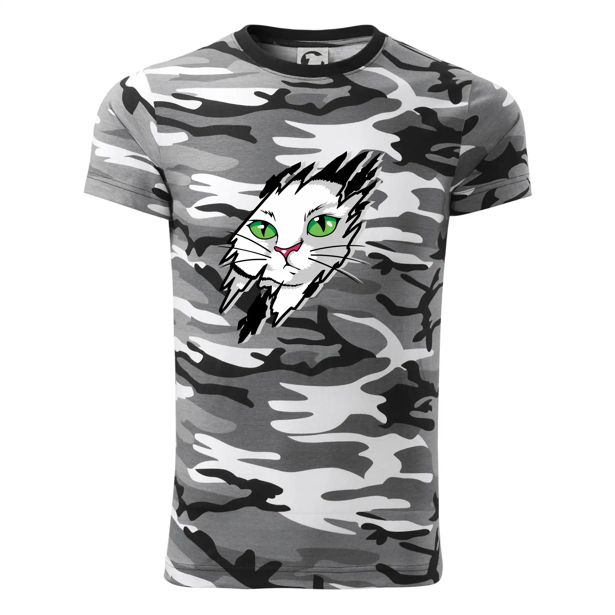 Tričko strednej gramáže vo farbách camouflage. Strih s bočnými švami. Lem priekrčníku z rebrového úpletu s prídavkom 5% elastanu. Vnútorná časť zadného priekrčníka začistená páskou vo farbe camouflage.