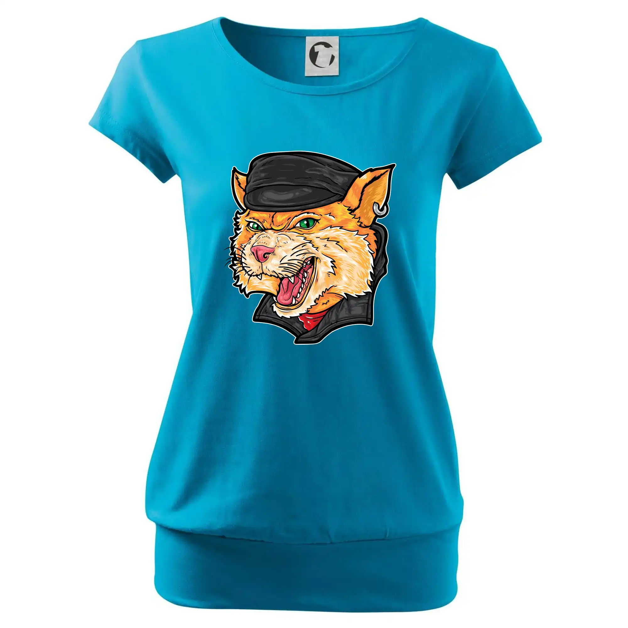 Trendové dámske tričko s veľmi krátkym rukávom, voľnejšieho strihu, v dolnom kraji všité do širokého lemu. Okrúhly priekrčník s úzkym lemom zo zhodného materiálu.