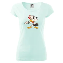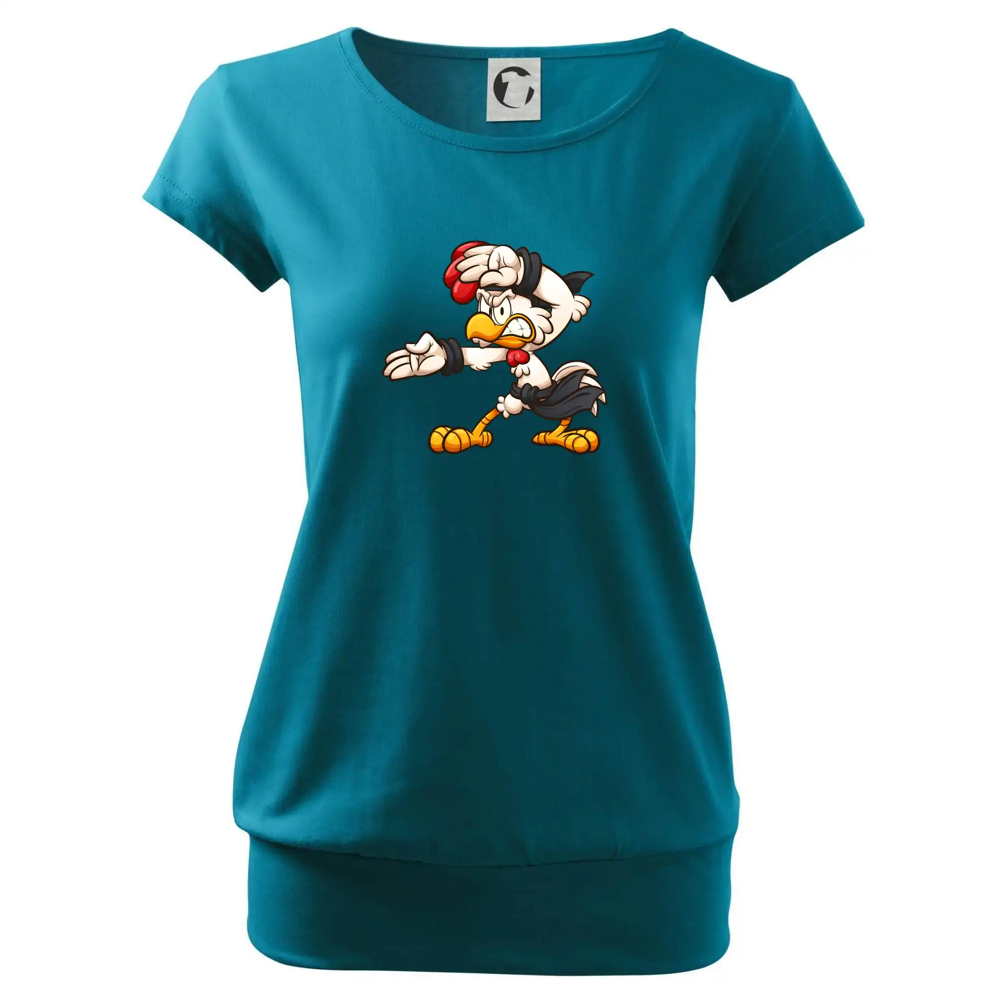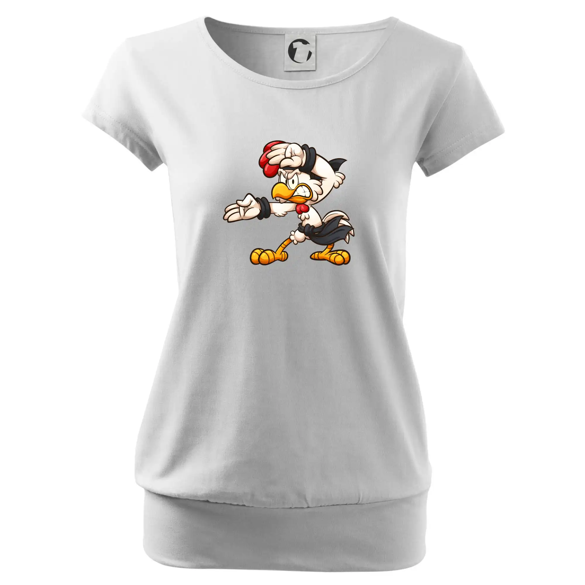 Trendové dámske tričko s veľmi krátkym rukávom, voľnejšieho strihu, v dolnom kraji všité do širokého lemu. Okrúhly priekrčník s úzkym lemom zo zhodného materiálu.