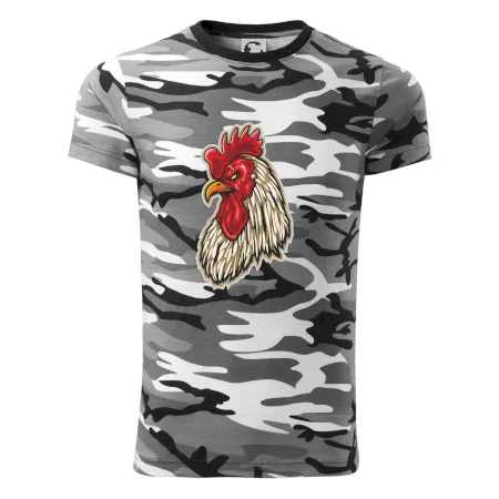 Tričko strednej gramáže vo farbách camouflage. Strih s bočnými švami. Lem priekrčníku z rebrového úpletu s prídavkom 5% elastanu. Vnútorná časť zadného priekrčníka začistená páskou vo farbe camouflage.