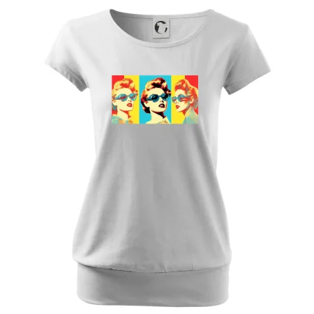 Trendové dámske tričko s veľmi krátkym rukávom, voľnejšieho strihu, v dolnom kraji všité do širokého lemu. Okrúhly priekrčník s úzkym lemom zo zhodného materiálu.