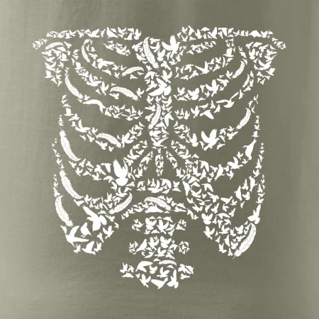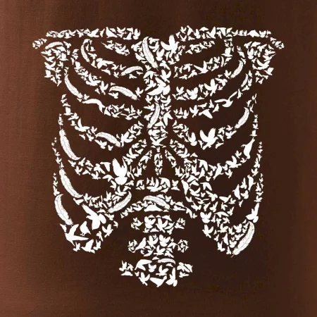 Umělecká kombinace ptáčků a kostry na triku.