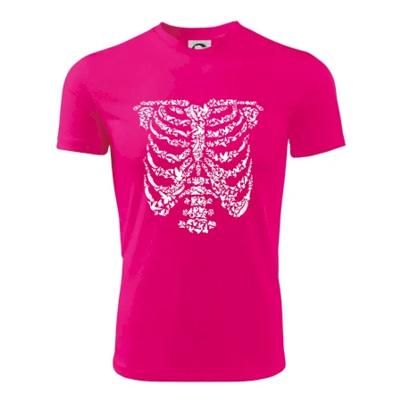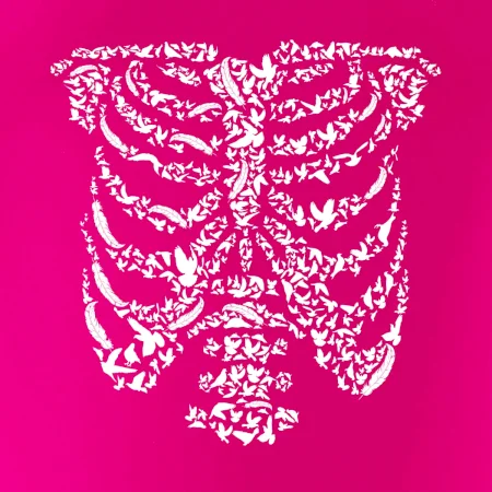 Umělecká kombinace ptáčků a kostry na triku.