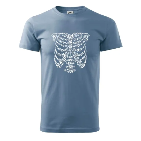 Umělecká kombinace ptáčků a kostry na triku.