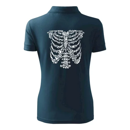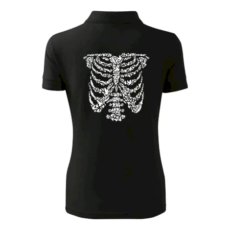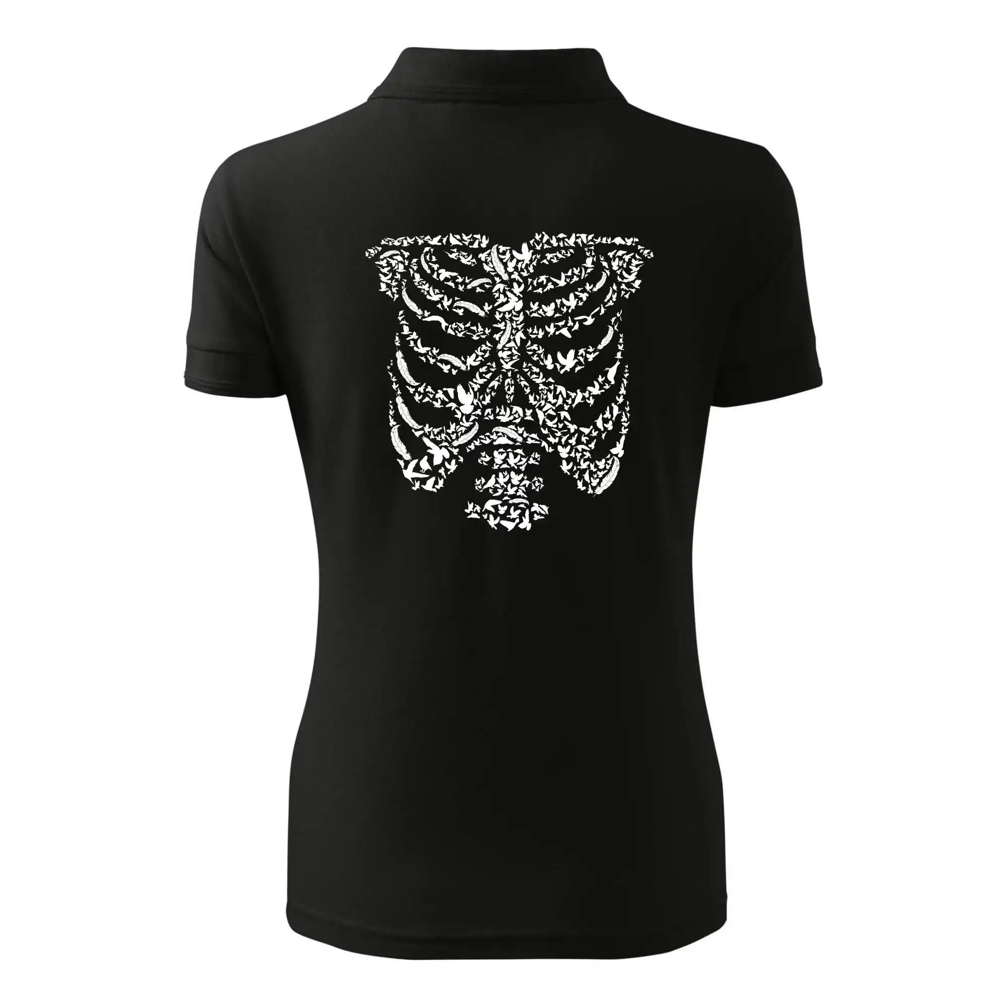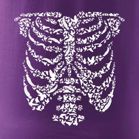 Umělecká kombinace ptáčků a kostry na triku.