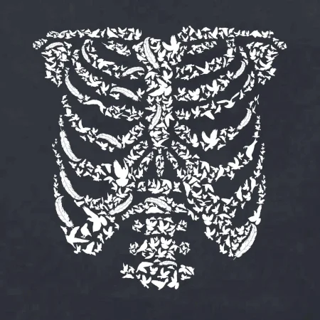 Umělecká kombinace ptáčků a kostry na triku.