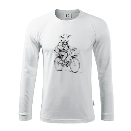 Krava v obleku na bicykli