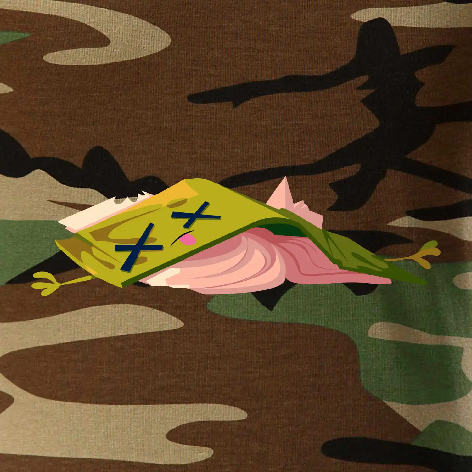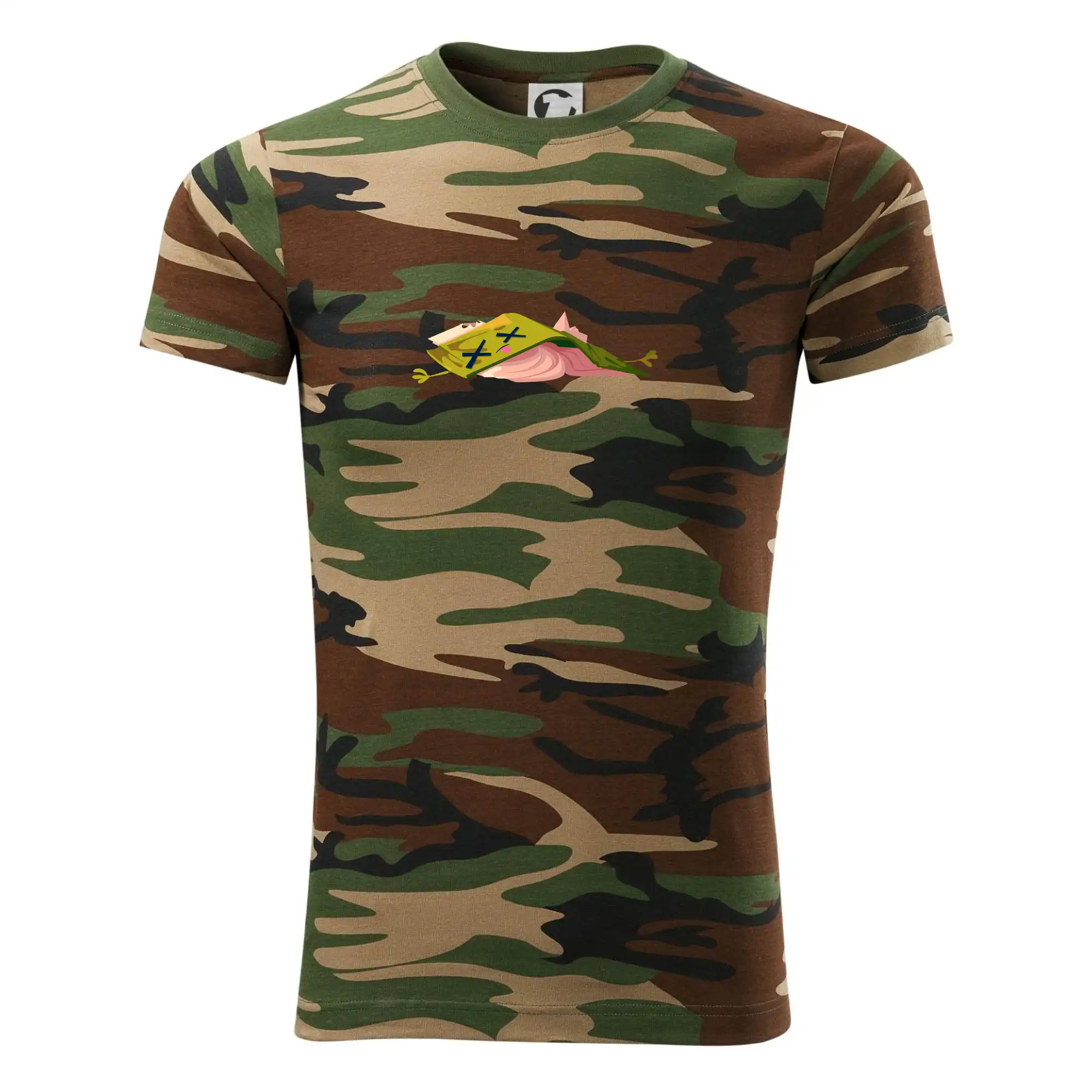 Tričko strednej gramáže vo farbách camouflage. Strih s bočnými švami. Lem priekrčníku z rebrového úpletu s prídavkom 5% elastanu. Vnútorná časť zadného priekrčníka začistená páskou vo farbe camouflage.