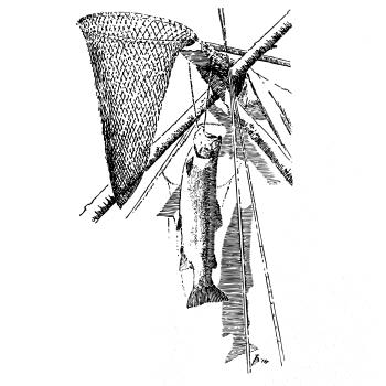 Kreslený podberák a chytená ryba