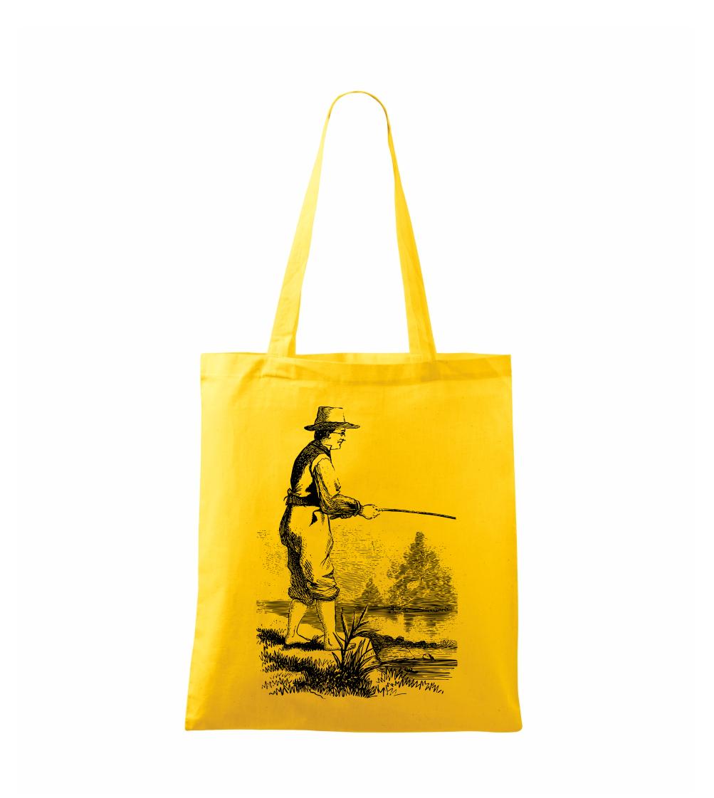 Kreslený rybár s vytiahnutými nohavicami