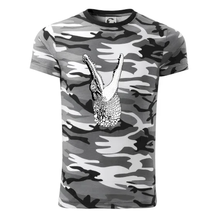 Tričko strednej gramáže vo farbách camouflage. Strih s bočnými švami. Lem priekrčníku z rebrového úpletu s prídavkom 5% elastanu. Vnútorná časť zadného priekrčníka začistená páskou vo farbe camouflage.