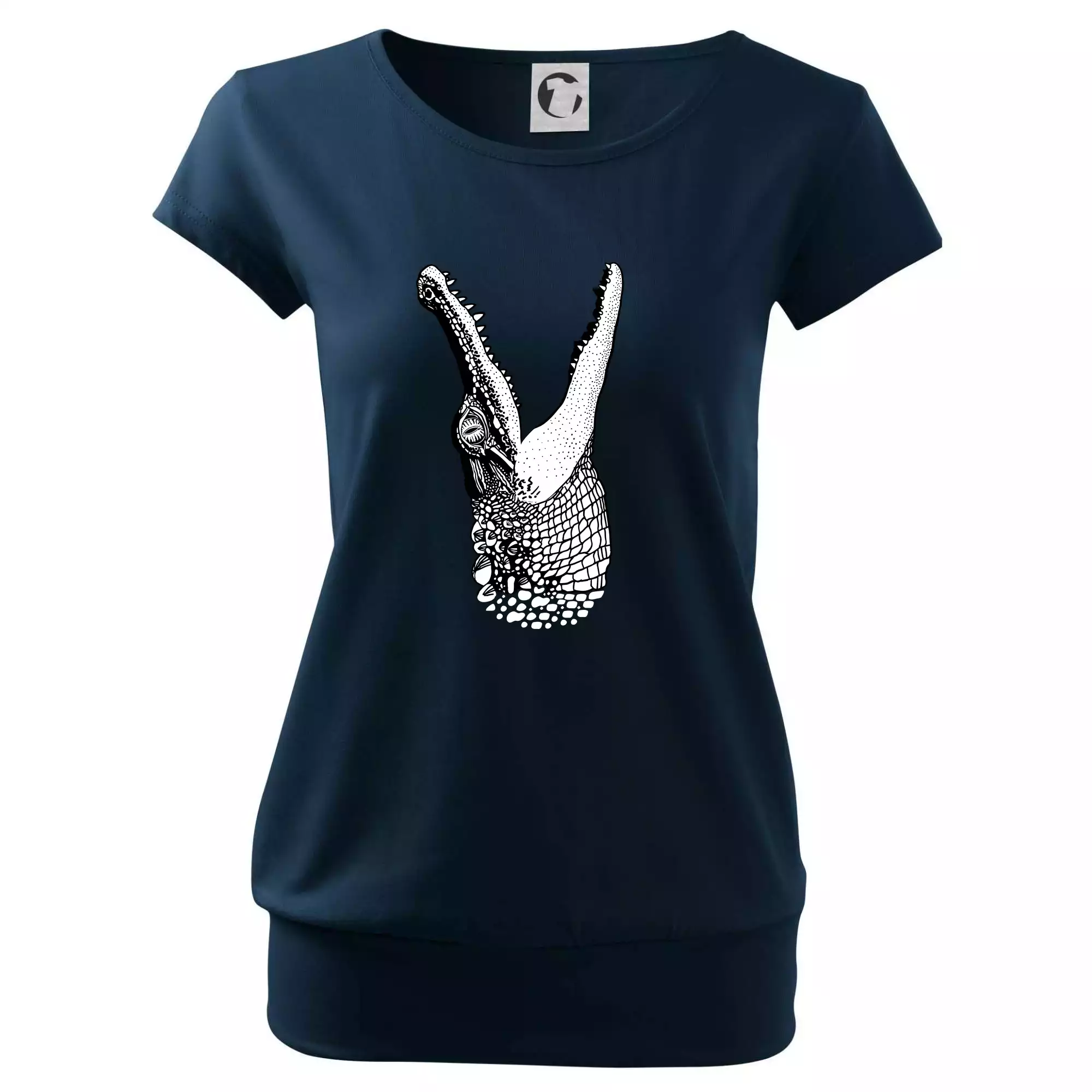 Trendové dámske tričko s veľmi krátkym rukávom, voľnejšieho strihu, v dolnom kraji všité do širokého lemu. Okrúhly priekrčník s úzkym lemom zo zhodného materiálu.
