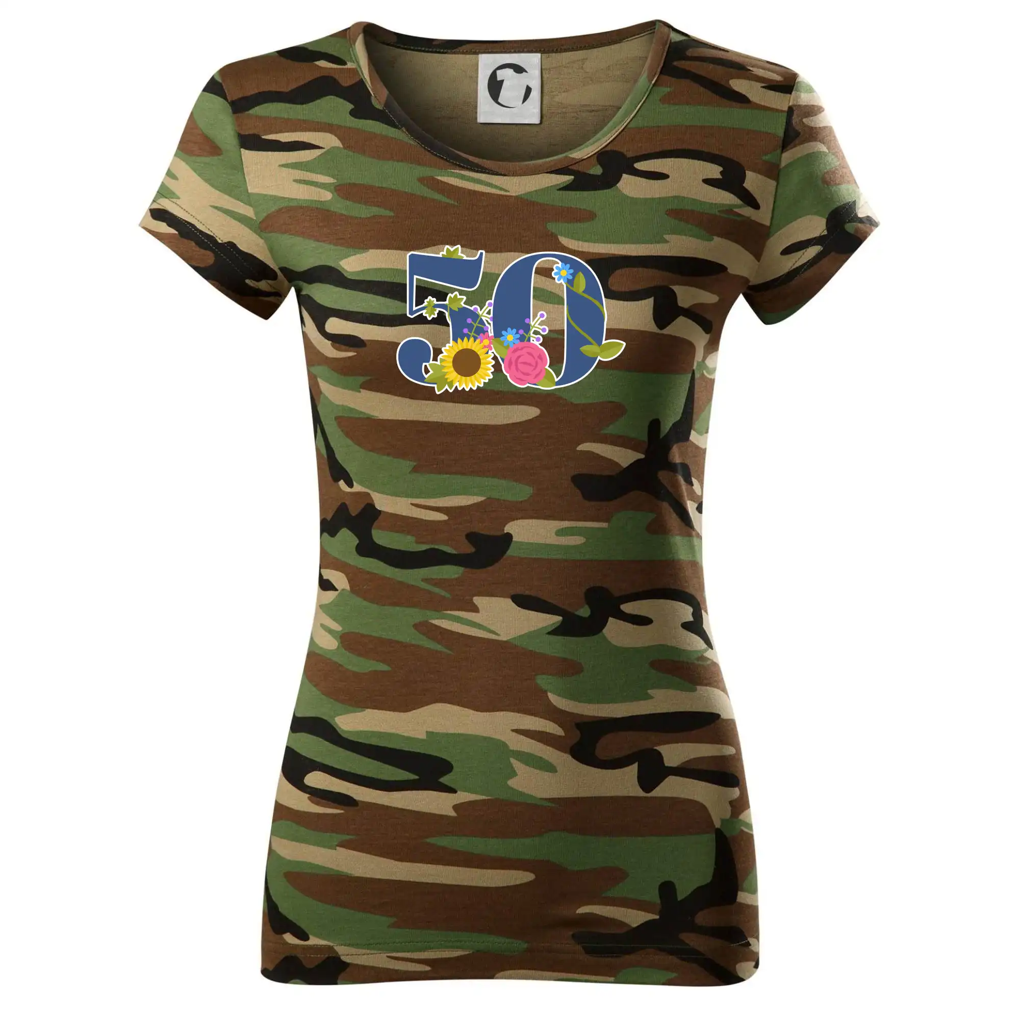 Narodeninové tričko pre oslávenca, ktorý oslavuje jubileum 50 rokov. Tričko, na ktorom je číslovka 50 s kvetmi. Darček k päťdesiatym narodeninám.