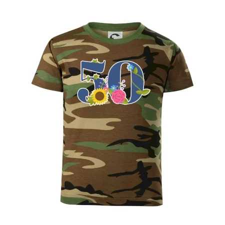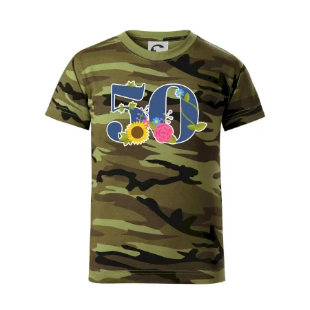 Narodeninové tričko pre oslávenca, ktorý oslavuje jubileum 50 rokov. Tričko, na ktorom je číslovka 50 s kvetmi. Darček k päťdesiatym narodeninám.