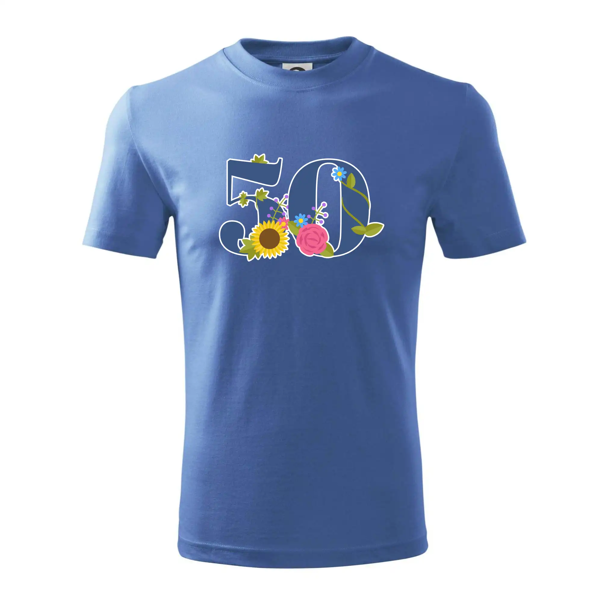 Narodeninové tričko pre oslávenca, ktorý oslavuje jubileum 50 rokov. Tričko, na ktorom je číslovka 50 s kvetmi. Darček k päťdesiatym narodeninám.