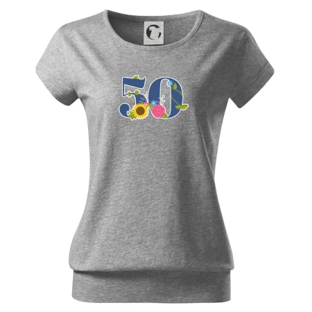 Narodeninové tričko pre oslávenca, ktorý oslavuje jubileum 50 rokov. Tričko, na ktorom je číslovka 50 s kvetmi. Darček k päťdesiatym narodeninám.