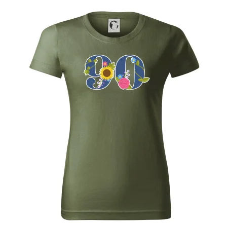 Narodeninové tričko pre oslávenca, ktorý oslavuje jubileum 90 rokov. Tričko, na ktorom je číslovka 90 s kvetmi. Darček k deväťdesiatym narodeninám.