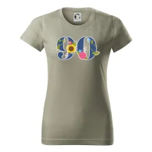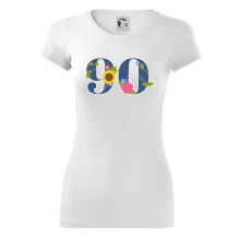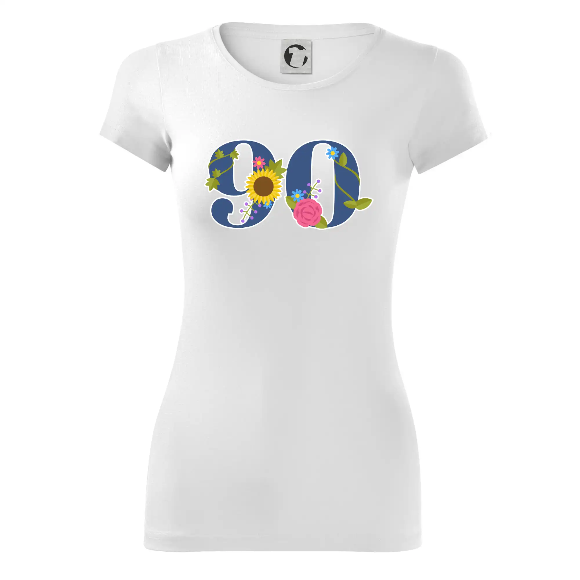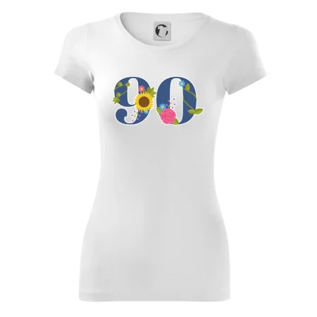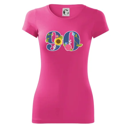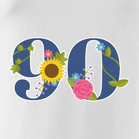 Narodeninové tričko pre oslávenca, ktorý oslavuje jubileum 90 rokov. Tričko, na ktorom je číslovka 90 s kvetmi. Darček k deväťdesiatym narodeninám.