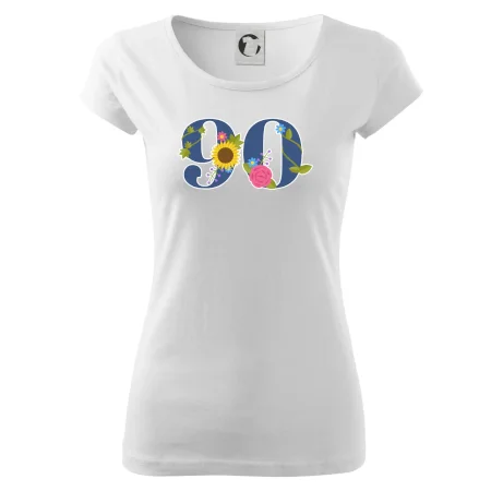 Narodeninové tričko pre oslávenca, ktorý oslavuje jubileum 90 rokov. Tričko, na ktorom je číslovka 90 s kvetmi. Darček k deväťdesiatym narodeninám.