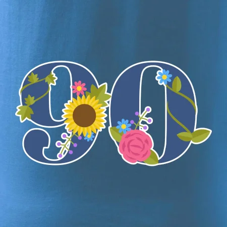 Narodeninové tričko pre oslávenca, ktorý oslavuje jubileum 90 rokov. Tričko, na ktorom je číslovka 90 s kvetmi. Darček k deväťdesiatym narodeninám.