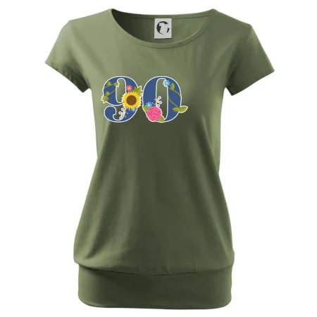 Narodeninové tričko pre oslávenca, ktorý oslavuje jubileum 90 rokov. Tričko, na ktorom je číslovka 90 s kvetmi. Darček k deväťdesiatym narodeninám.