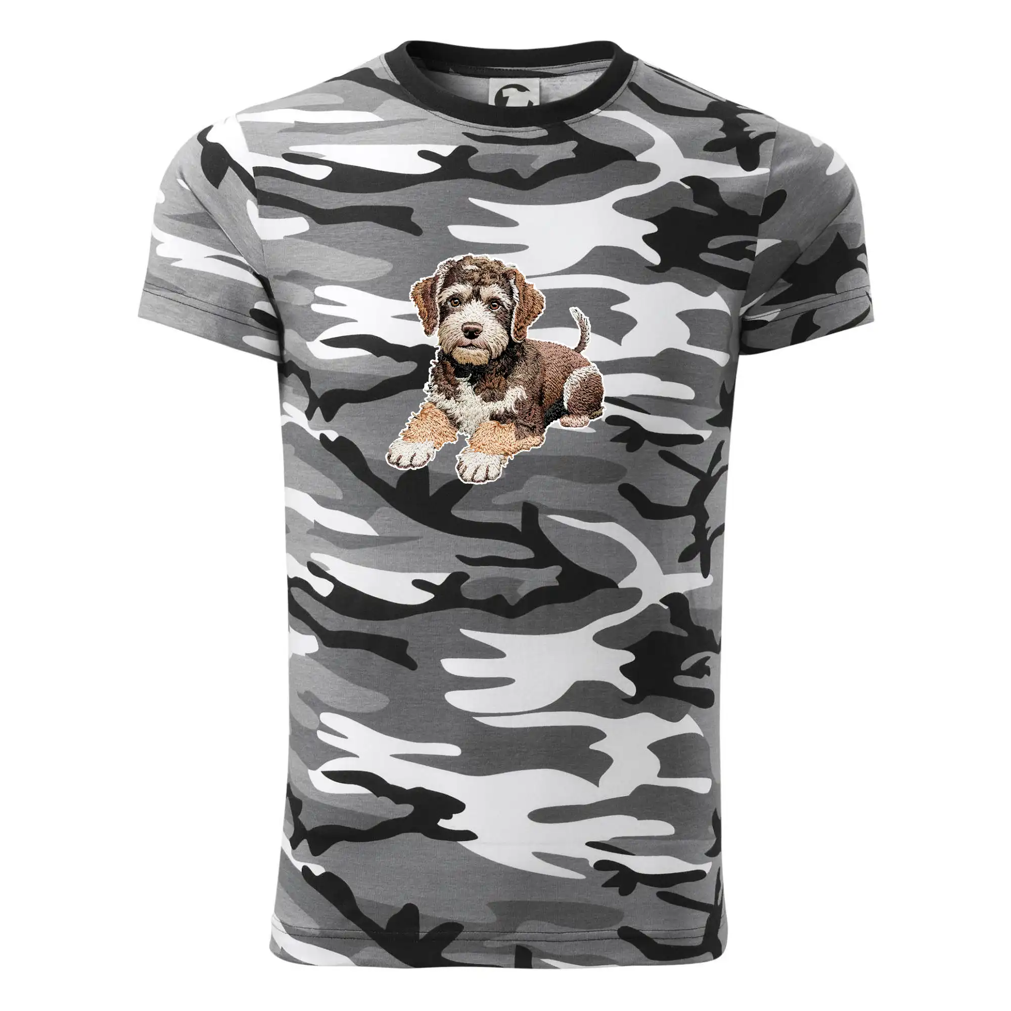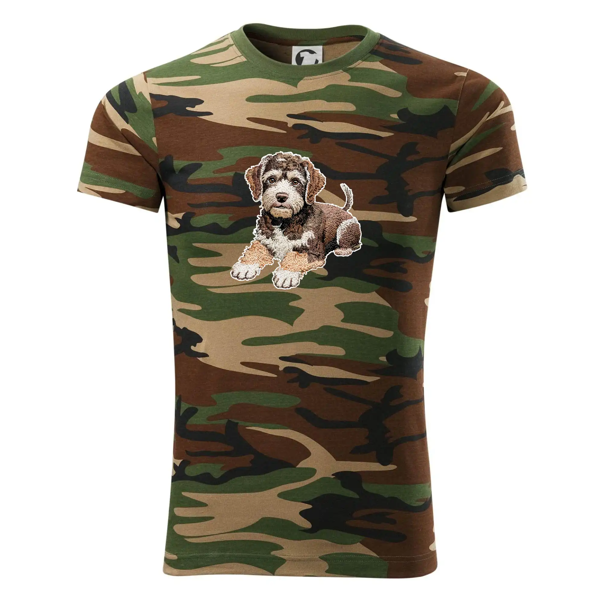 Tričko strednej gramáže vo farbách camouflage. Strih s bočnými švami. Lem priekrčníku z rebrového úpletu s prídavkom 5% elastanu. Vnútorná časť zadného priekrčníka začistená páskou vo farbe camouflage.