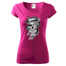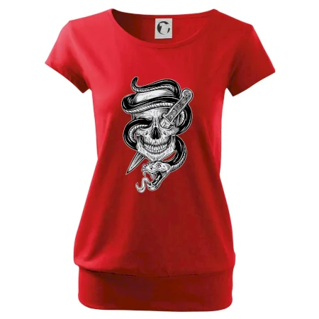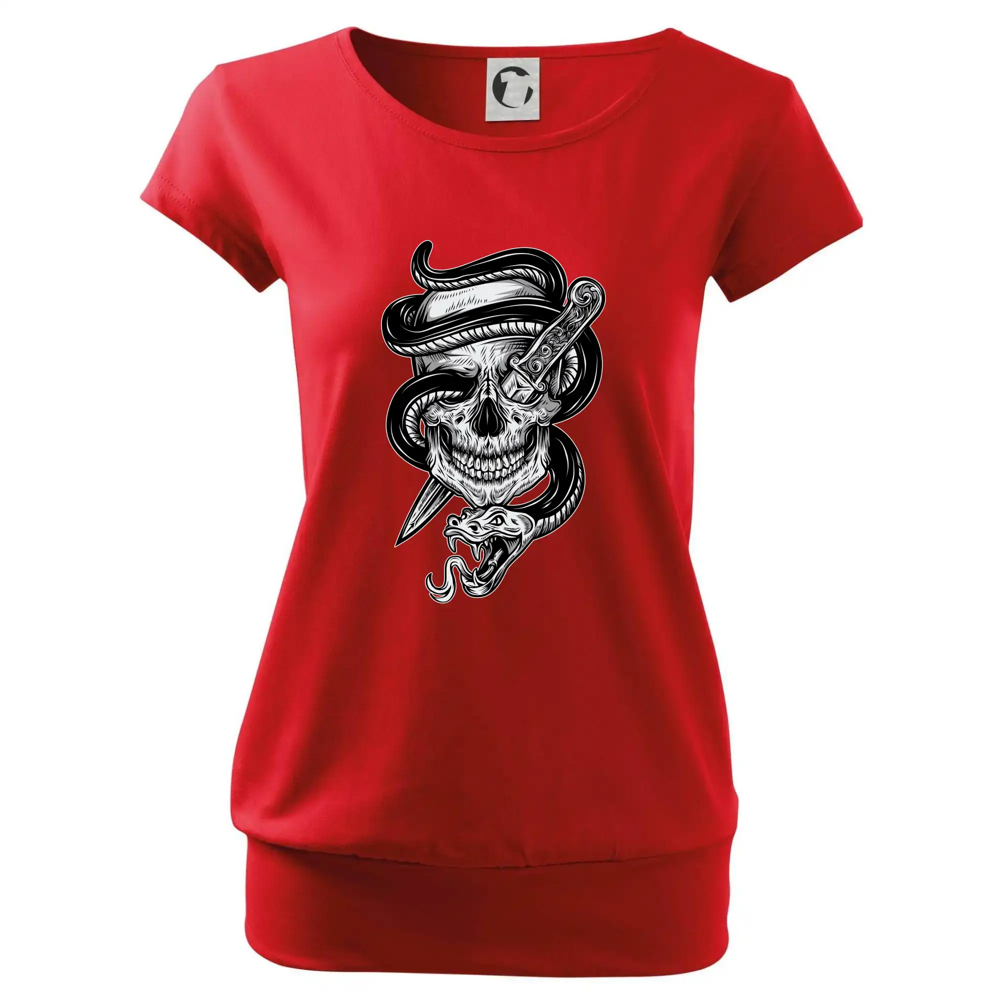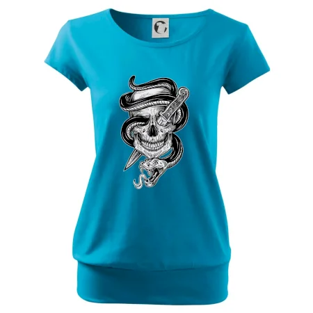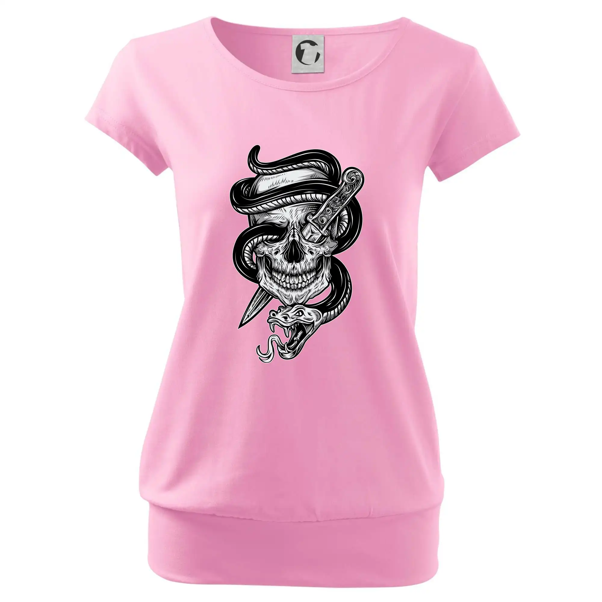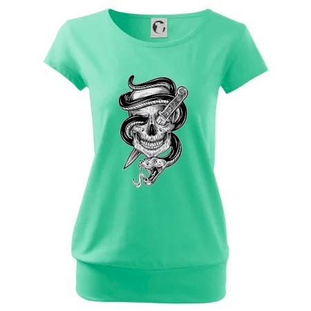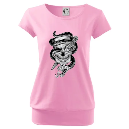 Trendové dámske tričko s veľmi krátkym rukávom, voľnejšieho strihu, v dolnom kraji všité do širokého lemu. Okrúhly priekrčník s úzkym lemom zo zhodného materiálu.