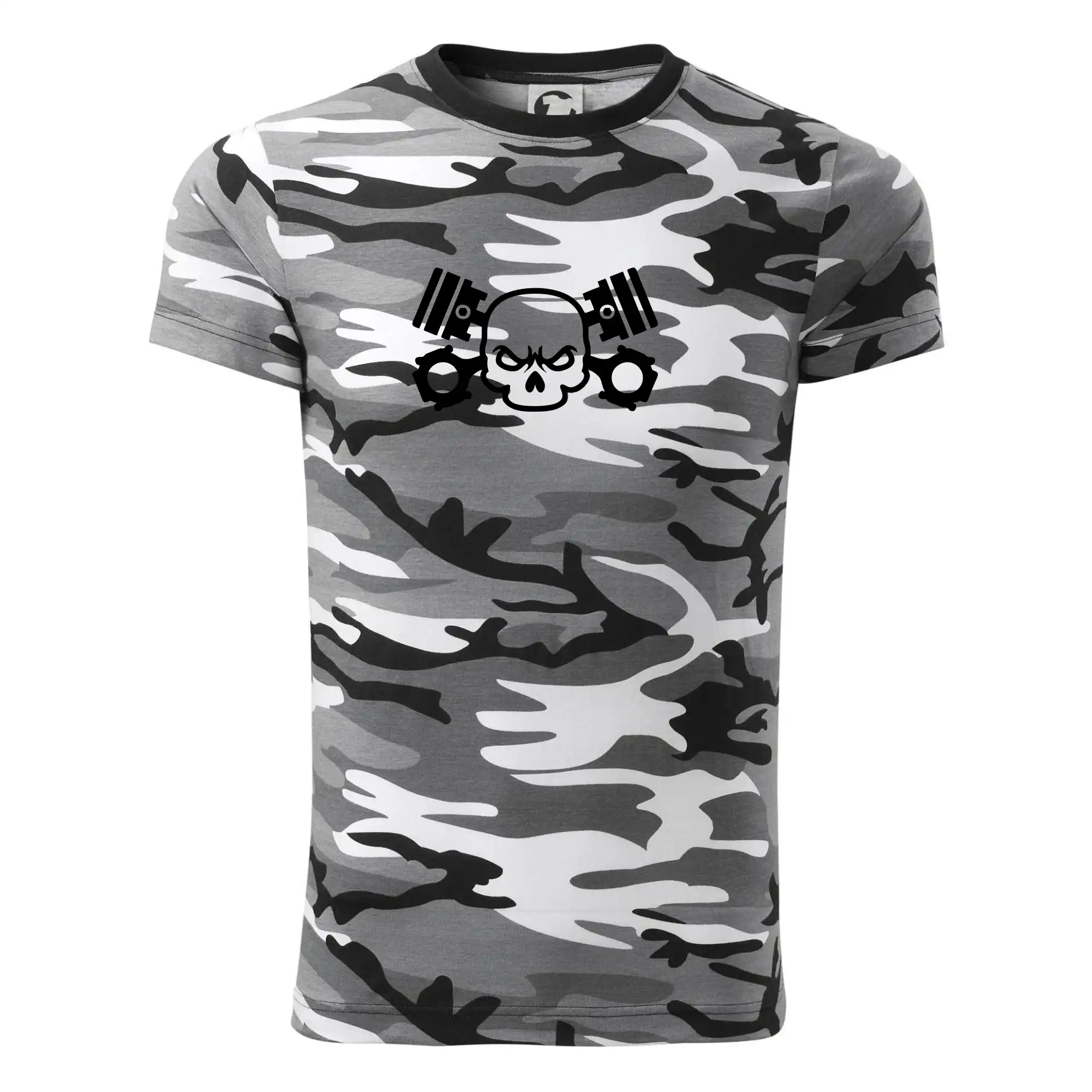 Tričko strednej gramáže vo farbách camouflage. Strih s bočnými švami. Lem priekrčníku z rebrového úpletu s prídavkom 5% elastanu. Vnútorná časť zadného priekrčníka začistená páskou vo farbe camouflage.