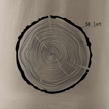 Grafika tvorí kruhy pripomínajúce letokruhy stromu, v ktorých sa opakuje číslo 50 ako symbol veku — vrstvy života znázornené jednoduchým, prírodným motívo