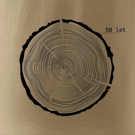 Grafika tvorí kruhy pripomínajúce letokruhy stromu, v ktorých sa opakuje číslo 50 ako symbol veku — vrstvy života znázornené jednoduchým, prírodným motívo