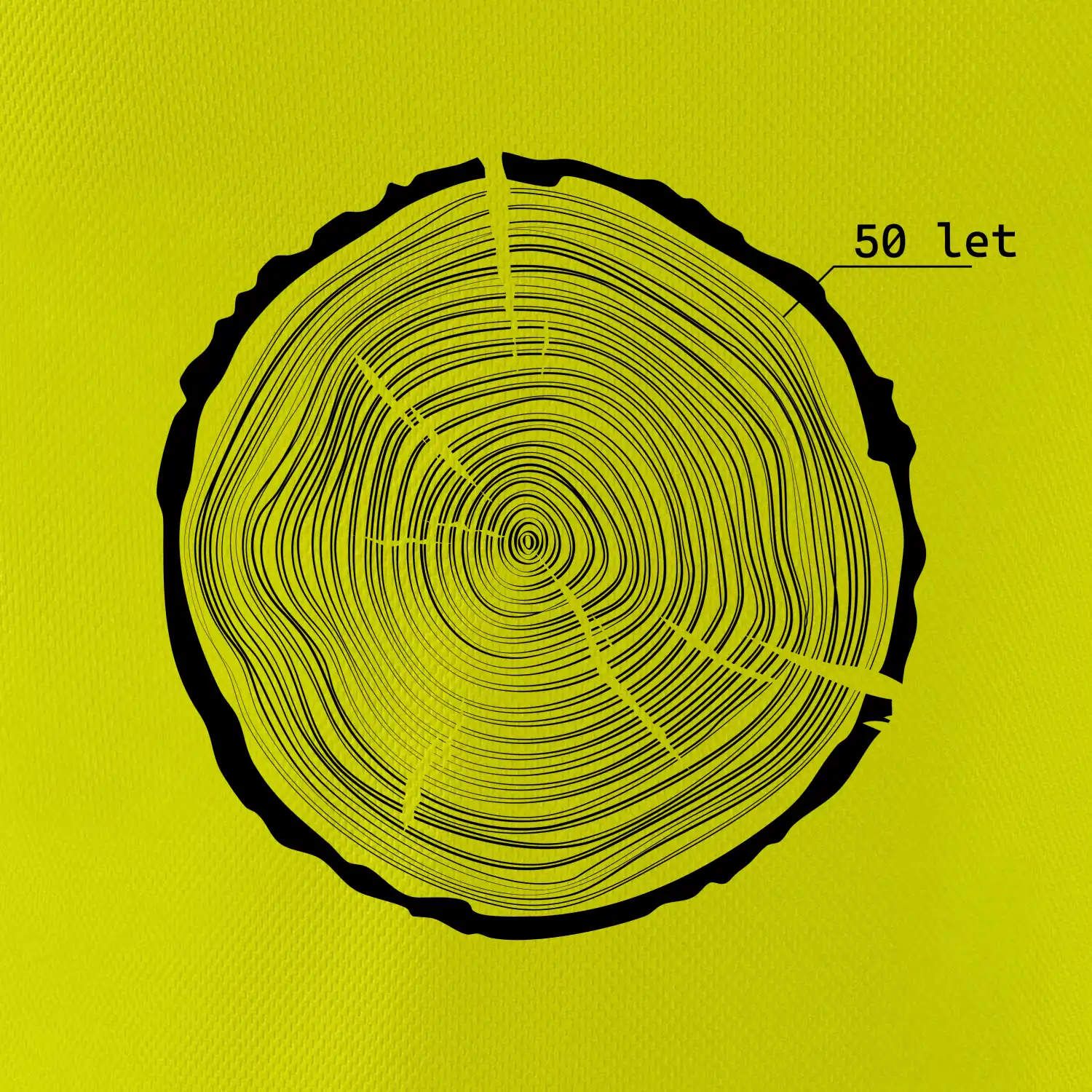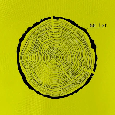 Grafika tvorí kruhy pripomínajúce letokruhy stromu, v ktorých sa opakuje číslo 50 ako symbol veku — vrstvy života znázornené jednoduchým, prírodným motívo