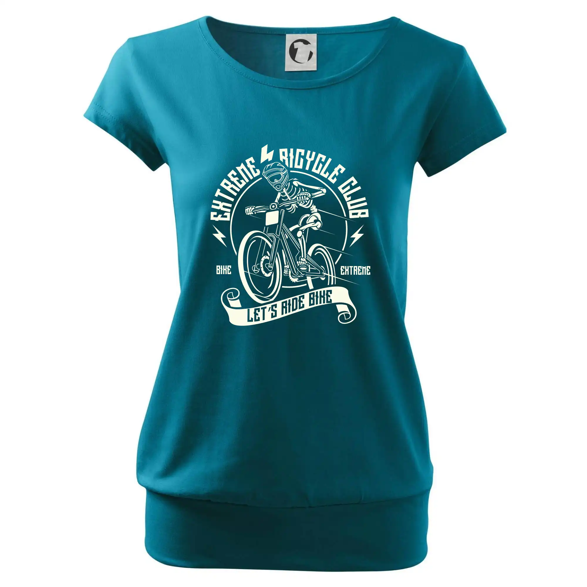 Trendové dámske tričko s veľmi krátkym rukávom, voľnejšieho strihu, v dolnom kraji všité do širokého lemu. Okrúhly priekrčník s úzkym lemom zo zhodného materiálu.